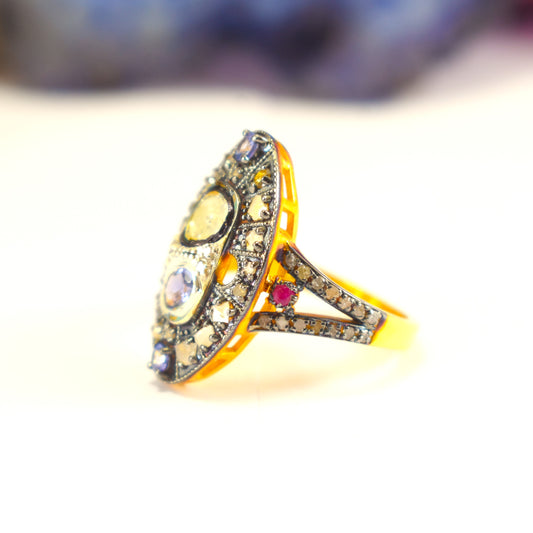 Unique Elegant Design Ring With Sapphire Ruby Polki And Pave Diamond In 925 Sterling Silver