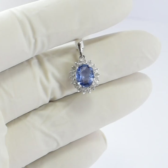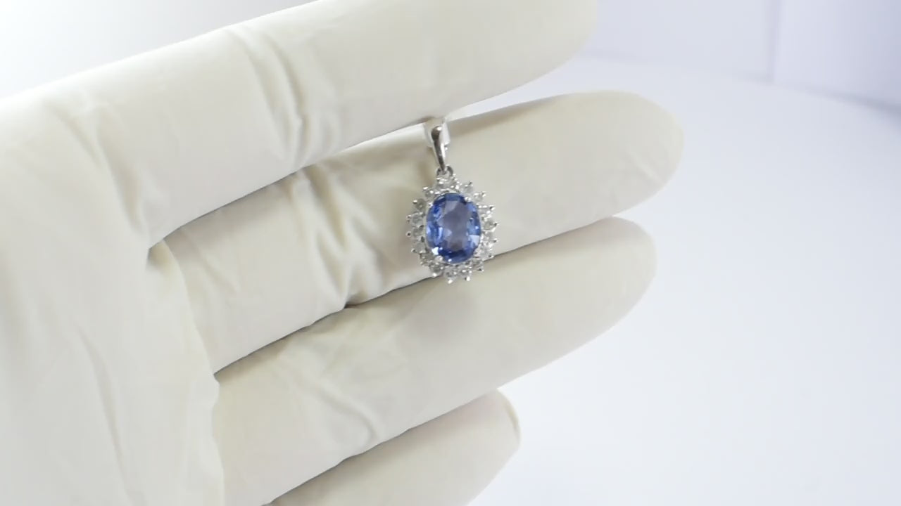 Elevate your jewelry collection with this elegant Sapphire and Diamond Cluster Pendant crafted in luxurious 14K white gold. Featuring a stunning 2.01 carat oval-cut blue sapphire as the centerpiece, this pendant radiates timeless beauty and sophistication. The sapphire is surrounded by a halo of brilliant 0.42 carat round-cut diamonds, adding extra sparkle and enhancing the pendant’s classic charm. Designed for both everyday elegance and special occasions, this gemstone pendant is lightweight at just 1.918 grams, making it perfect for comfortable, all-day wear. Whether you're searching for a unique sapphire pendant, a meaningful birthstone necklace, or a stylish gift for her, this exquisite piece offers unmatched brilliance and craftsmanship. Add a touch of luxury to your look with this handcrafted white gold sapphire and diamond necklace that captures attention with every glance.